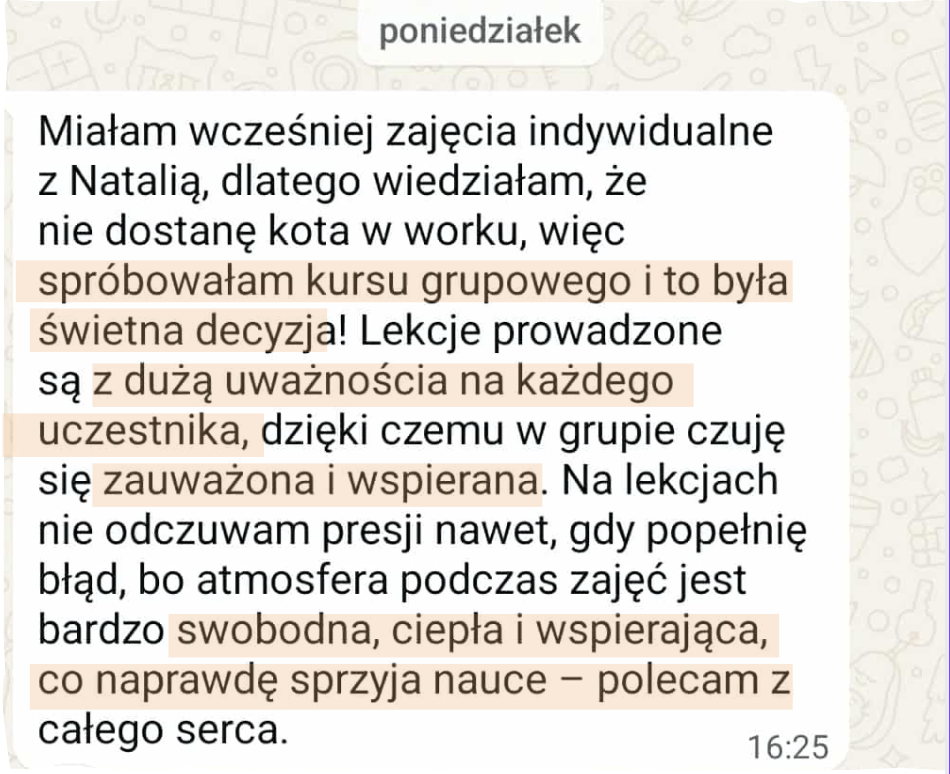 Przed dołączeniem do kursu zapraszam Cię na bezpłatną konsultację wstępną, na której sprawdzę Twój poziom i wybiorę najlepszą grupę dla Ciebie.