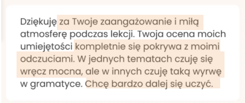- pisemne podsumowanie postępów po kursie - widzisz swój progres z dłuższej perspektywy i otrzymasz rekomendacje co do dalszej nauki